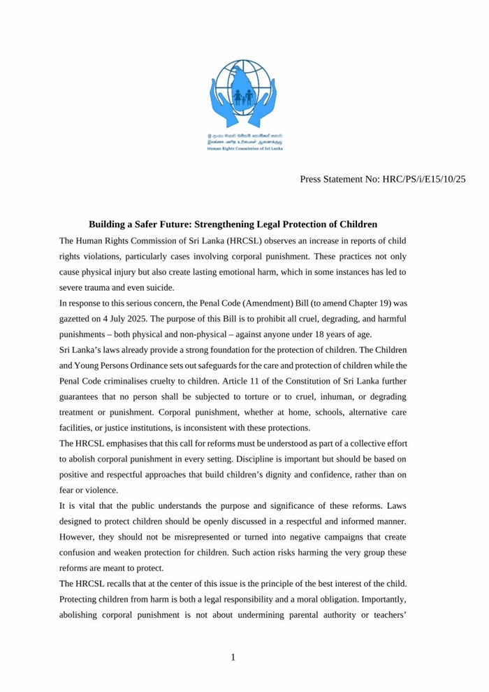 Referring to the Penal Code (Amendment) Bill gazetted on 4 July 2025, the HRCSL said the proposed legislation seeks to prohibit all forms of cruel, degrading and harmful punishments—both physical and non-physical—against anyone under 18 years of age.