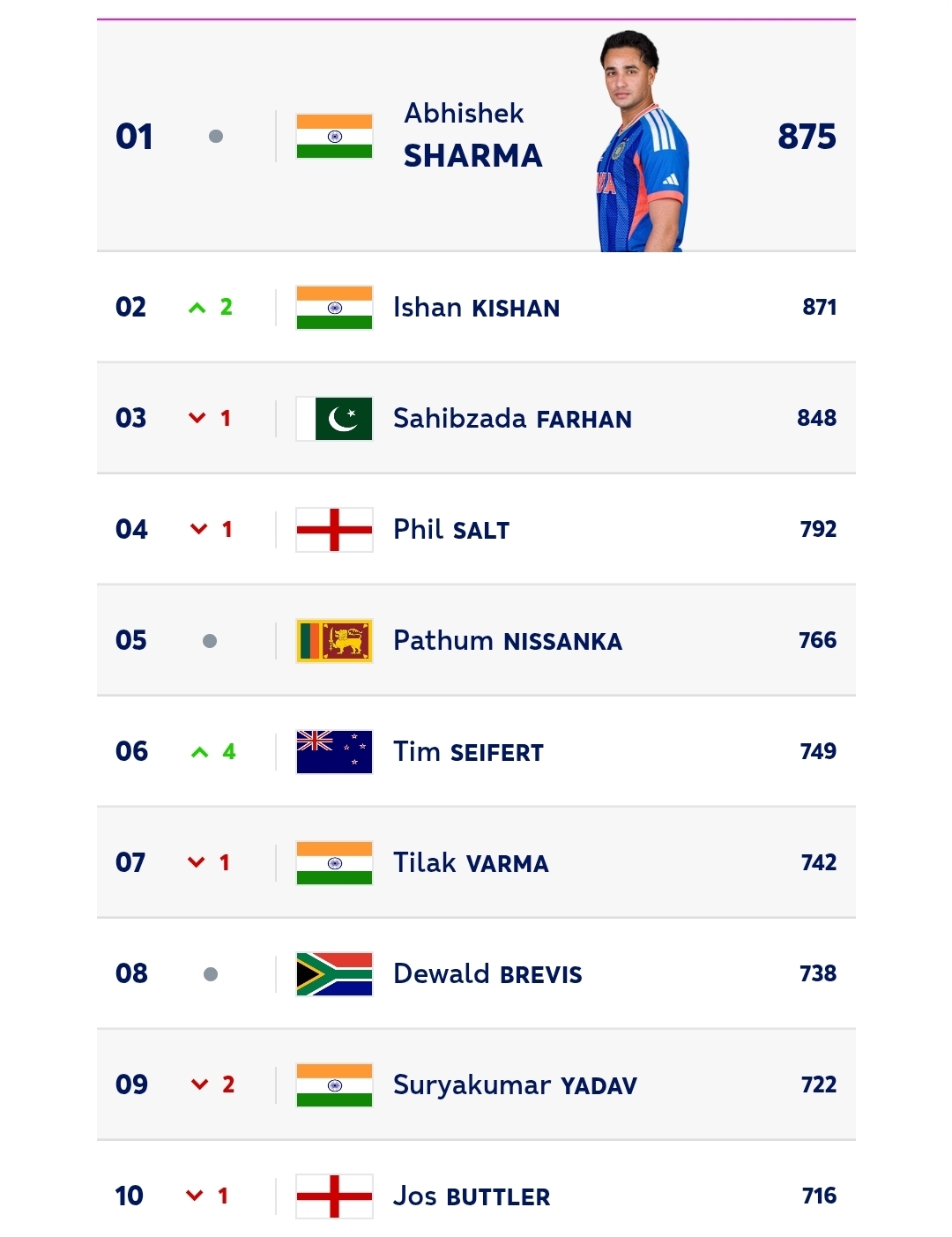 Sharma is currently on 875 rating points, his 21-ball 52 against New Zealand in the final of the ICC Men’s T20 World Cup 2026 at the Narendra Modi Stadium ensuring he still leads the table, while Kishan’s 52 off 25 balls against the Kiwis and 39 off 18 against England in the semifinal have helped him leapfrog Phil Salt of England and Sahibzada Farhan of Pakistan into second place.