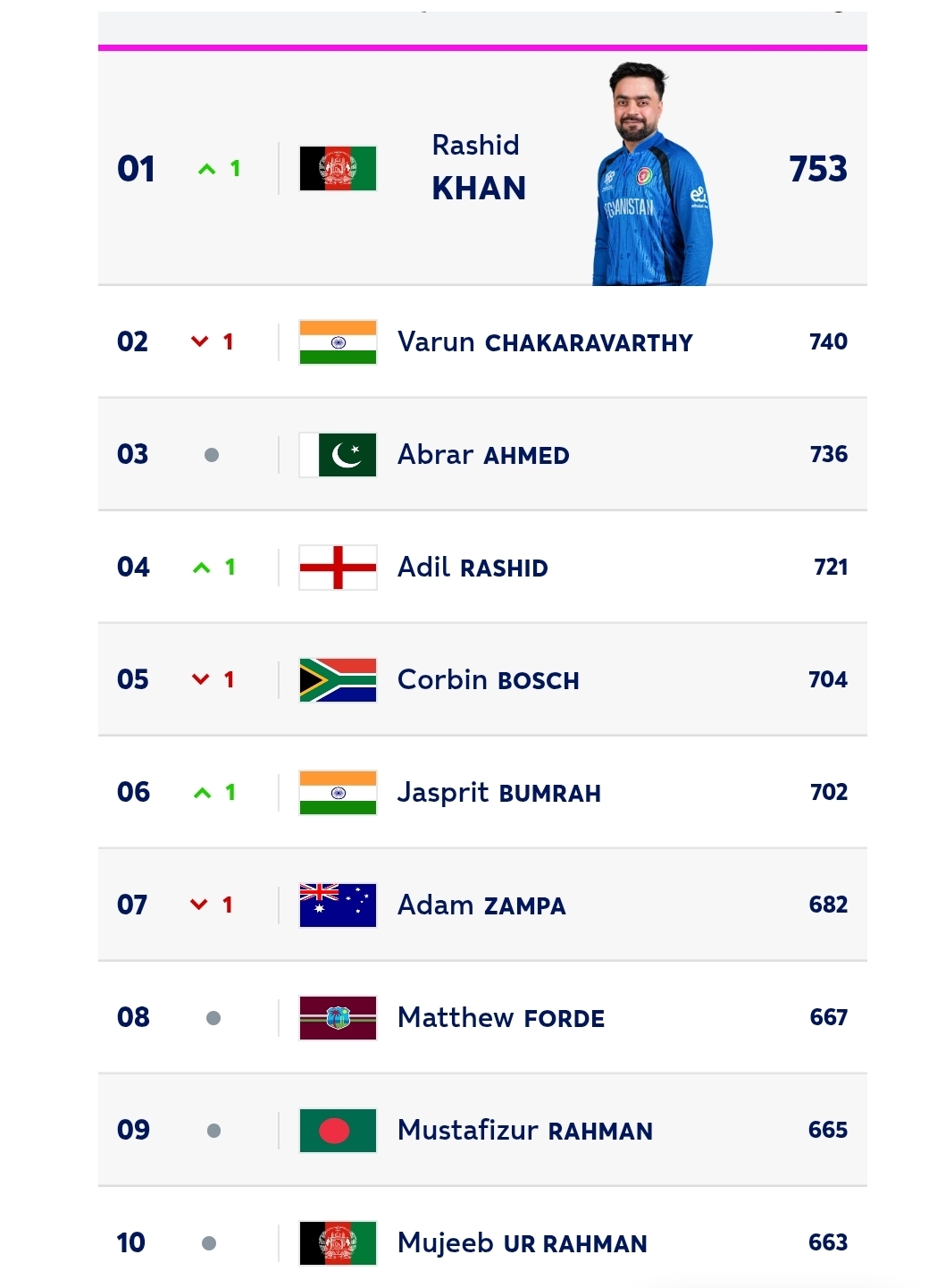 Afghanistan star Rashid Khan, who has spent more than four years at the top of the T20I bowling rankings, is back to number one with another leg-spinner Adil Rashid of England also moving up one spot to fourth position after taking two for 41 in the semifinal against India.