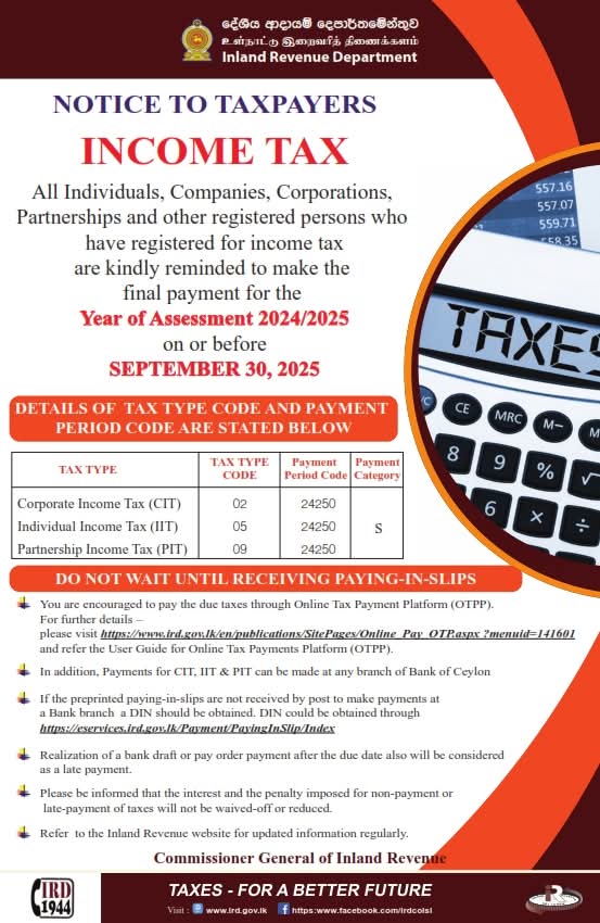 The Inland Revenue Department has reminded all taxpayers to make their final income tax payments for the Year of Assessment 2024/2025 on or before September 30, 2025.