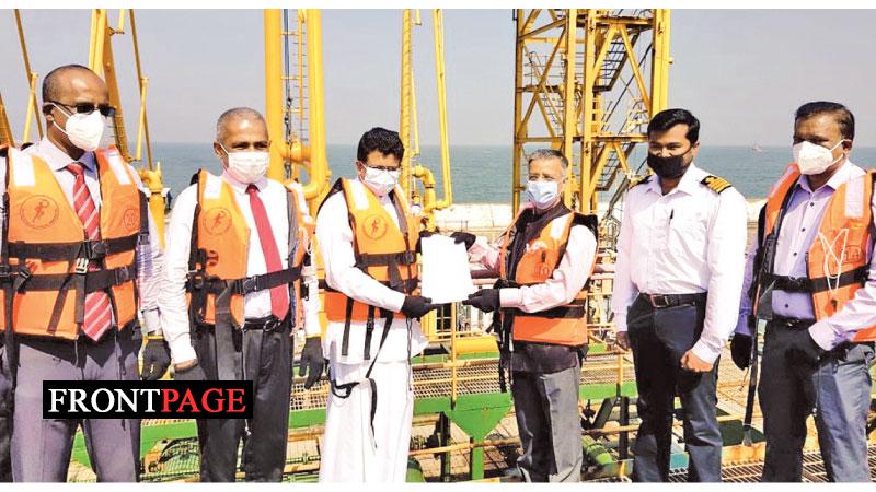 India yesterday handed over a fuel consignment of 40,000 metric tonnes from the Indian Oil Corporation (IOC) to Sri Lanka as part of the bilateral partnership to ensure energy security in the country. The fuel consignment was delivered by the Oil tanker ‘Swarna Pushp’ arriving from India. Energy Minister Udaya Gammanpila receiving the necessary documents from Indian High Commissioner to Sri Lanka Gopal Baglay on board the oil tanker. Ceylon Petroleum Corporation Chairman Sumith Wijesinghe was also present.