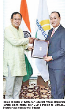 Indian Minister of State for External Affairs Rajkumar Ranjan Singh handed over a cheque for $1 million to BIMSTEC Secretary General Tenzin Lekphell in New Delhi.
