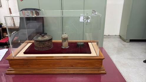 The relic ensemble is now preserved within an air-tight glass desiccator to prevent deterioration, with the contents resting on a cotton base for long-term conservation.