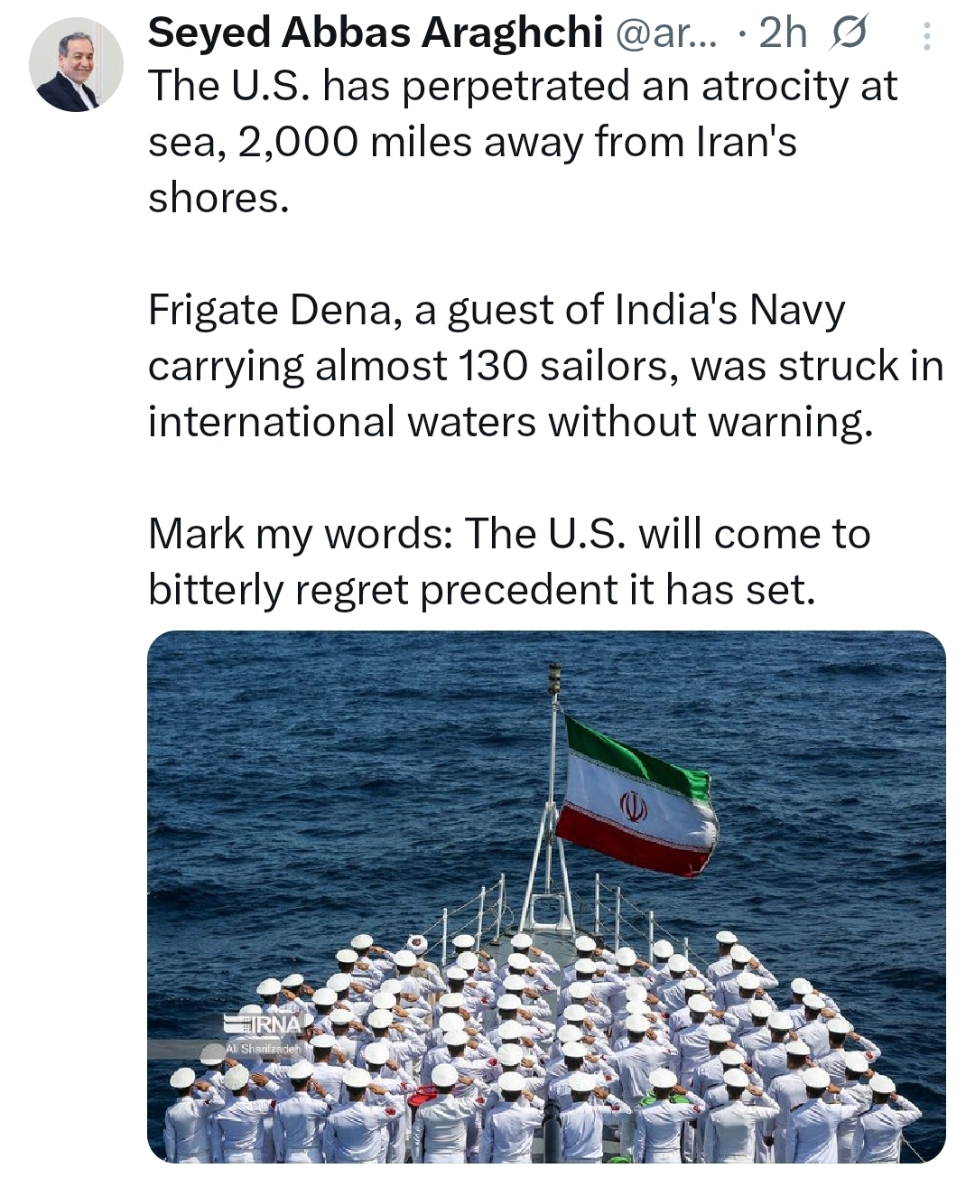 “The U.S. has perpetrated an atrocity at sea, 2,000 miles away from Iran’s shores,” Araghchi said in a statement. He added that the frigate had been a guest of the Indian Navy and warned that Washington would “bitterly regret the precedent it has set.”