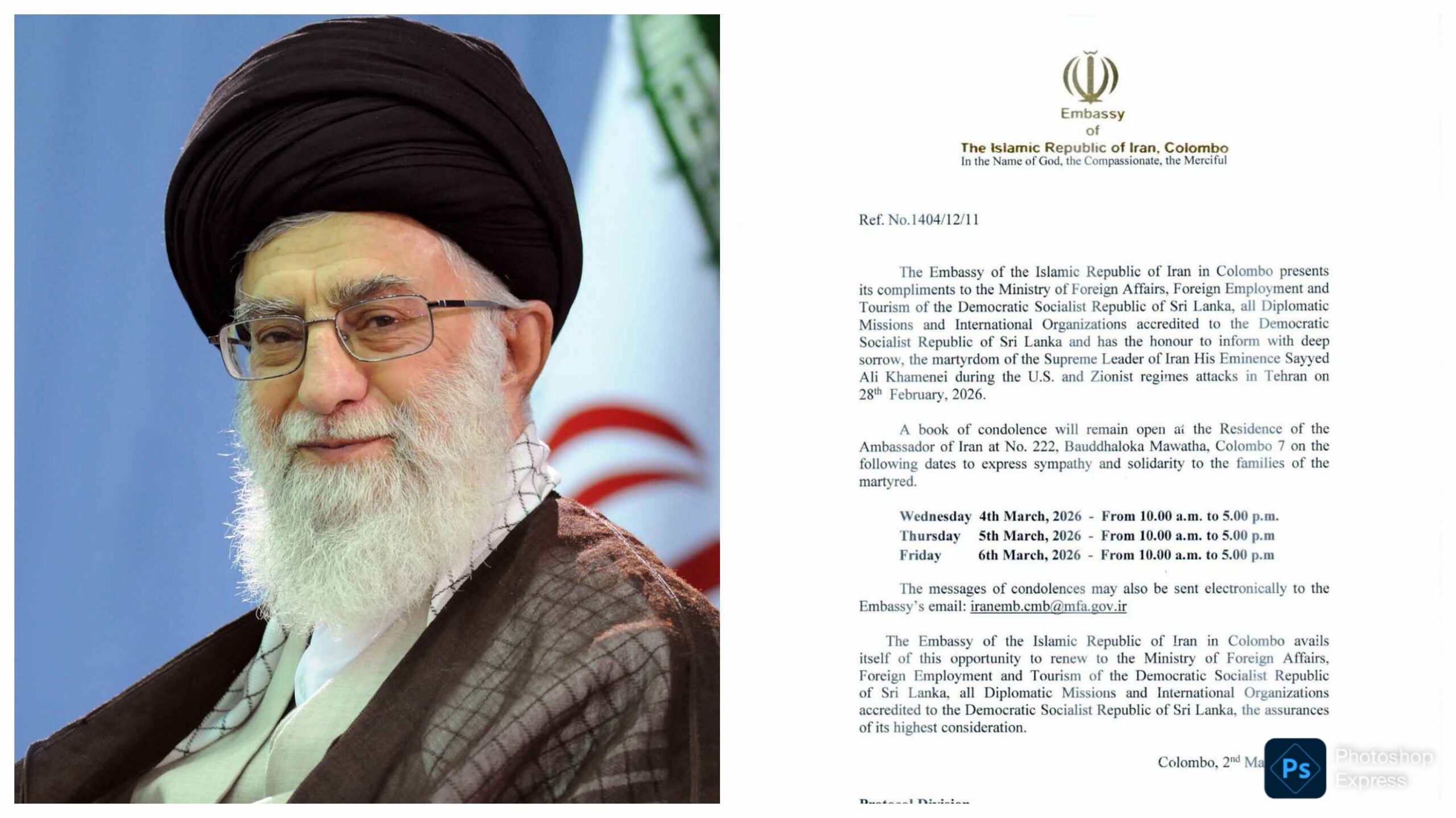The Embassy of the Islamic Republic of Iran in Colombo has announced that a book of condolence will be opened following the reported death of Iran’s Supreme Leader, Ayatollah Ali Khamenei.