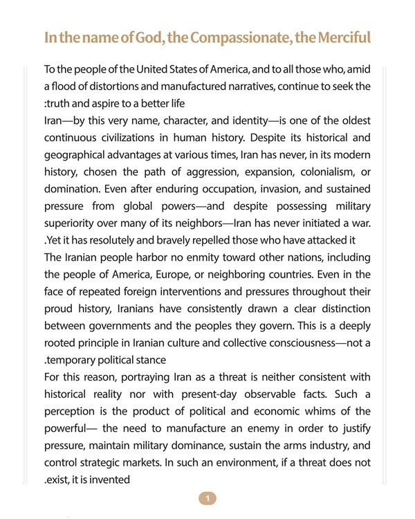 In the message, Pezeshkian emphasized Iran’s long history as one of the world’s oldest civilizations, stressing that the country has never initiated a war in modern times despite enduring invasions, sanctions, and foreign interventions. He noted that Iranians distinguish between governments and ordinary people, saying they hold no enmity toward Americans.