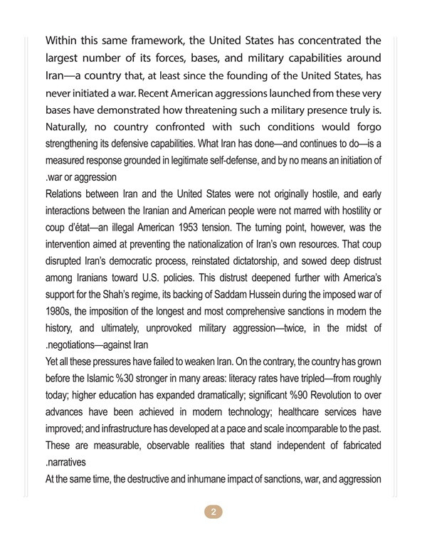 The Iranian President further explained that the decision to withdraw from that agreement, escalate toward confrontation, and launch two acts of aggression in the midst of negotiations were destructive choices made by the U.S. government, choices that served the delusions of a foreign aggressor.