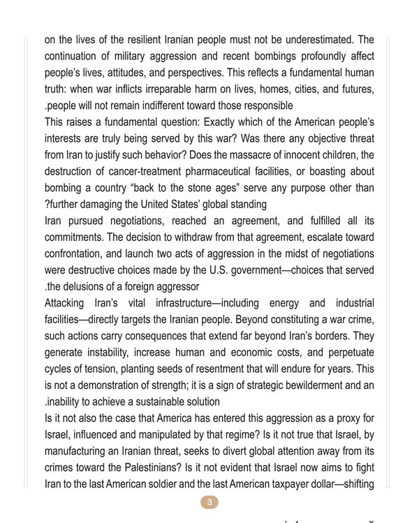 “Is it not also the case that America has entered this aggression as a proxy for Israel, influenced and manipulated by that regime? Is it not true that Israel, by manufacturing an Iranian threat, seeks to divert global attention away from its crimes toward the Palestinians? Is it not evident that Israel now aims to fight Iran to the last American soldier and the last American taxpayer dollar, shifting the burden of its delusions on to Iran, the region, and the United States itself in pursuit of illegitimate interests?” he questioned.