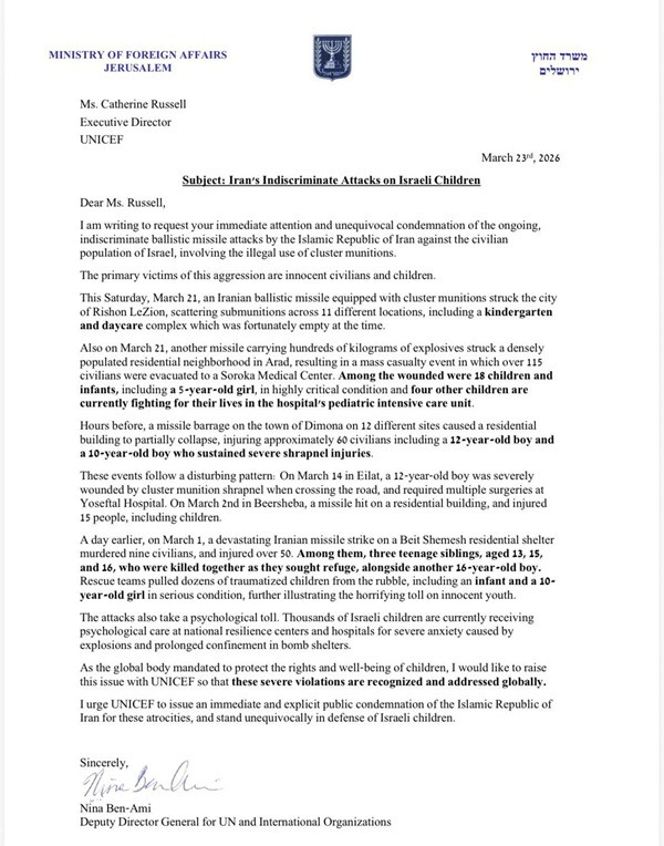Israel’s Ministry of Foreign Affairs has formally appealed to the United Nations Children’s Fund (UNICEF) to condemn what it describes as Iran’s indiscriminate missile attacks targeting Israeli civilians, particularly children.