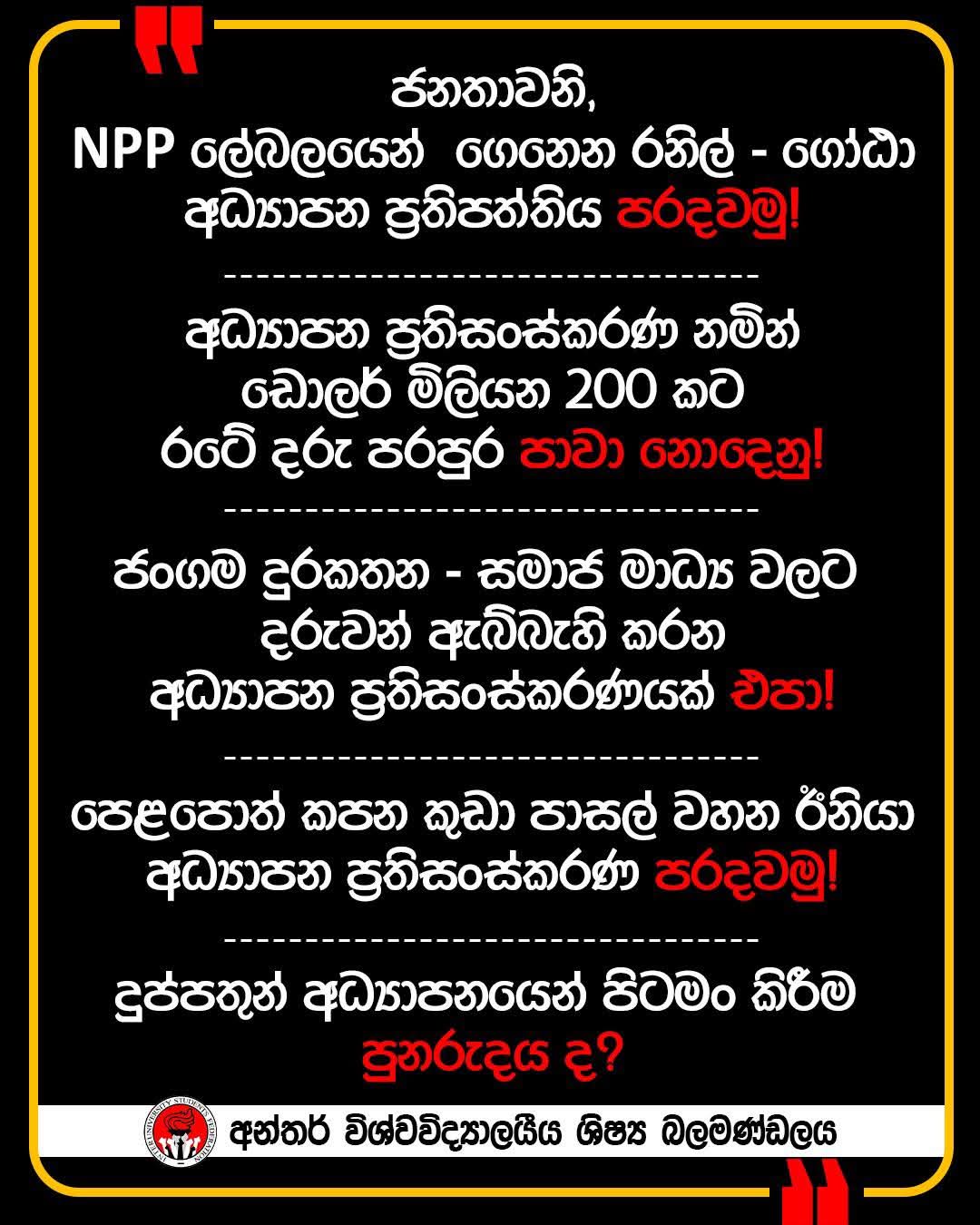 In a statement issued on Friday, the IUSF alleged that the education reforms being promoted under the National People’s Power (NPP) banner were aligned with policies previously pursued by former leaders Ranil Wickremesinghe and Gotabaya Rajapaksa.
