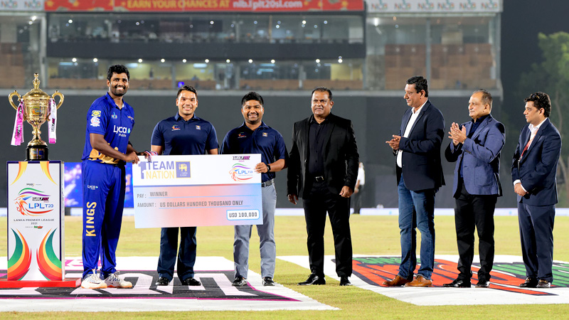 And it’s a wrap as Jaffna Kings live up to their name by winning the coveted title back-to-back by beating the Galle Gladiators at the LPL Final. L-R:Thisara Perera, Captain of the Jaffna Kings, Hon. Namal Rajapaksa MP – Minister of Youth & Sports, Hon. D.V. Chanaka MP – State Minister of Aviation and Export Zones Development, Shammi Silva – President, SLC, Ravin Wickramarathna – Vice President, SLC, Ashley De Silva – CEO, SLC, and Anil Mohan – Founder & CEO of The IPG Group.