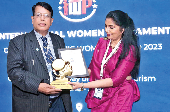 Charnika Imbulana Munasinghe, a veteran Journalist, Consultant Editor Colombo Times.net and Columnist, Daily Financial Times was presented with the Iconic Women 2023 Award at the International Women Parliamentarian Conclave held at Hotel Samratin New Delhi recently.