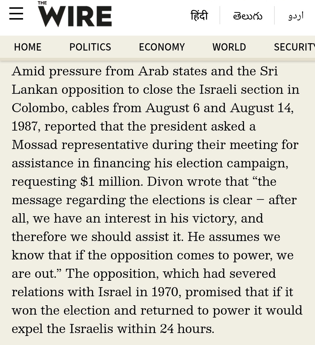 In a notable revelation, The Wire reported that then-President Junius Richard Jayewardene had also sought financial assistance from Israeli representatives. According to a diplomatic cable cited in the report, Jayewardene requested $1 million to support his election campaign, indicating that Sri Lanka would benefit from continued Israeli backing if he remained in power.