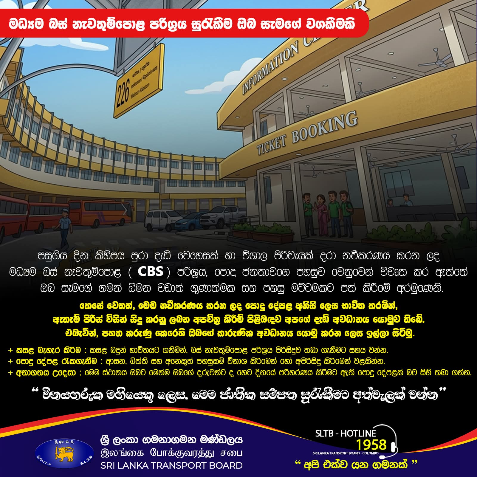 The Sri Lanka Transport Board (SLTB) has urged the public to protect the newly renovated Central Bus Stand (CBS), calling on commuters to help maintain cleanliness and safeguard public property.
