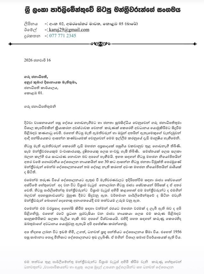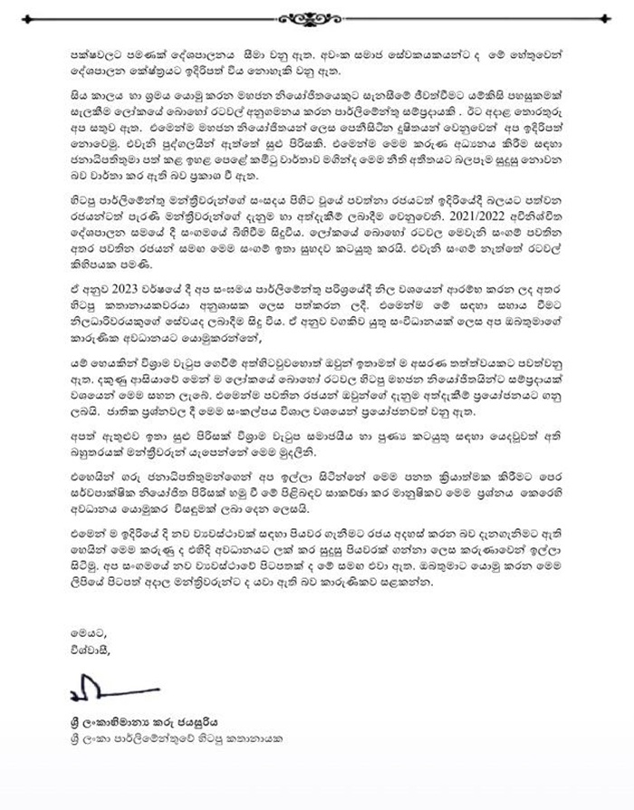 Former Speaker Karu Jayasuriya has sent a letter to President Anura Kumara Dissanayake regarding the abolition of pensions for Members of Parliament.