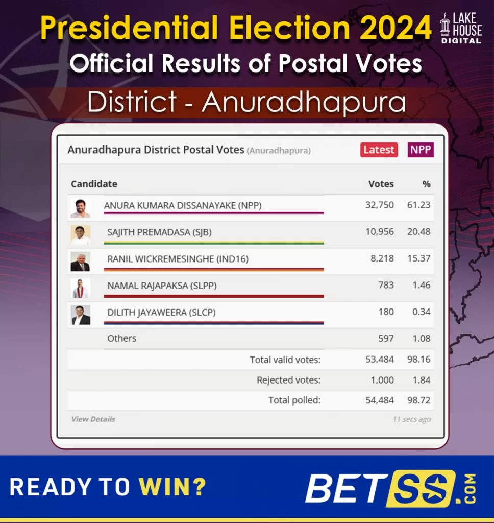 Kegalle, Anuradhapura District postal vote results Politics On Sep 21, 2024 FB IMG 1726957082575 968x1024 1 0 0 Share The postal vote result of the Kegalle and Anuradhapura Districts in the 2024 Presidential Election have been released by the Election Commission. The post Kegalle, Anuradhapura District postal vote results appeared first on DailyNews. 0 0 Share FacebookTwitterGoogle+ReddItWhatsAppPinterestEmail