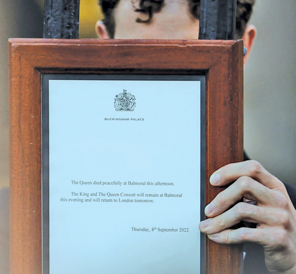 ![]() A notice announcing the death of Queen Elizabeth II is placed on the gate of Buckingham Palace in London, Britain, on Thursday. |