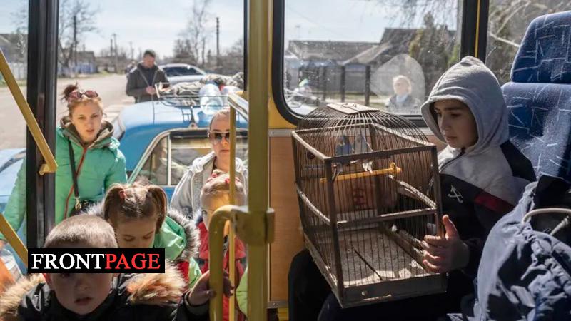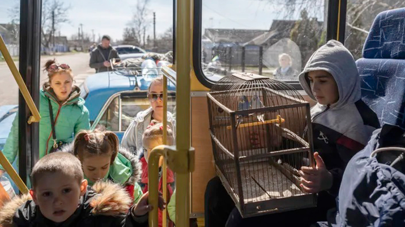 10-year-old Roma, holds a cage with two parrots inside a bus leaving from the city of Bashtanka, Mikolaiv district, Ukraine, after he and his family fled from Kherson which is occupied by the Russian Forces, on Thursday.