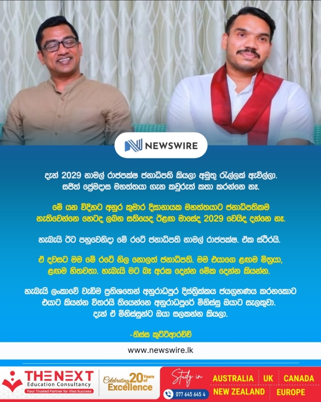 “It is not clear whether President Anura Kumara Dissanayake will lose power tomorrow, next week, next month, or only in 2029,” Kuttiarachchi said. “But when that moment happens, Namal Rajapaksa will be the president of this country. That is certain.”