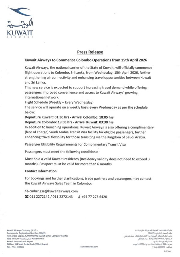The airline has invited trade partners and passengers to contact its Colombo sales team for bookings and inquiries via cmbrr.gsa@kuwaitairways.com, 011 2272142 / 011 2272143, or +94 77 275 6420. (Newswire)