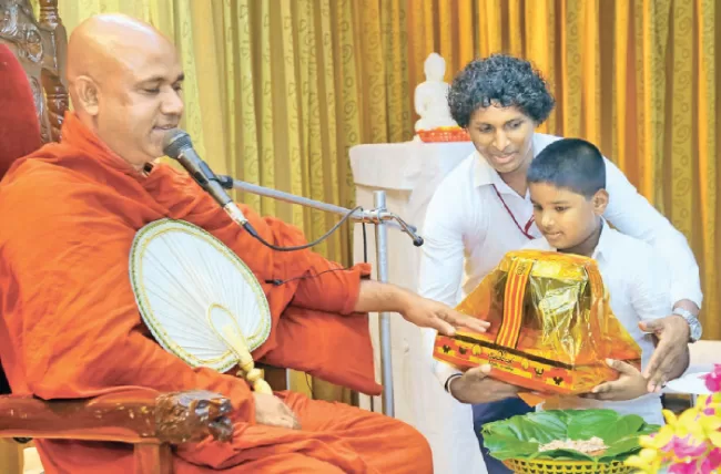 The monthly Dhamma sermon organized by the Lake House Buddhist Society was held at the company premises last week for January. Ven. Diyathalawe Piyadassi Thera of Maharagama Vaggiragyana Dharmayathanaya conducted the Dhamma sermon and Deputy Manager of the General Administration Department Dhammika Rajapaksa sponsored this month’s programme. The objective of the programme is to pass merits on the founder of the Lake House, the Late D. R. Wijewardene and the father of Dhammika Rajapaksa, the late R. M. K. G. Karunaratne. ANCL Chairman Professor Harendra Kariyawasam offering a tray of fruits to the Thera. Dhammika Rajapaksa is also seen offering the Ata Pirikara to the Thera.