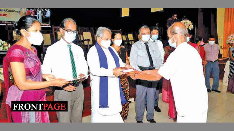 Sabaragamuwa Governor Tikiri Kobbekaduwa handing over land deeds for landless families in the Sabaragamuwa Province on Tuesday at the Sabaragamuwa Provincial Council Auditorium.