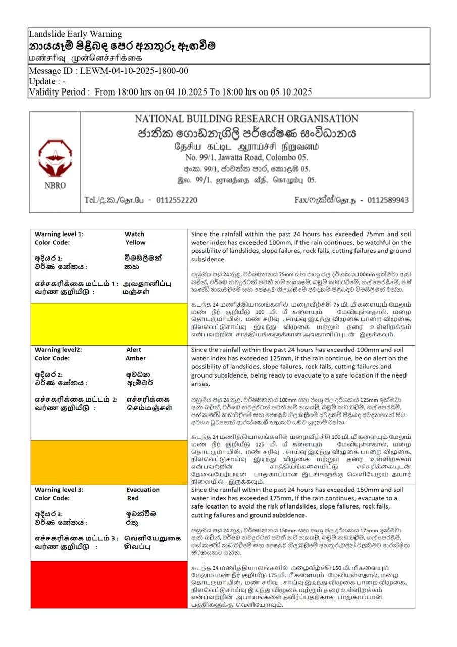 The National Building Research Organisation (NBRO) has issued a Level 1 (Yellow) landslide early warning effective from 6 p.m. on October 4 to 6 p.m. on October 5, 2025.