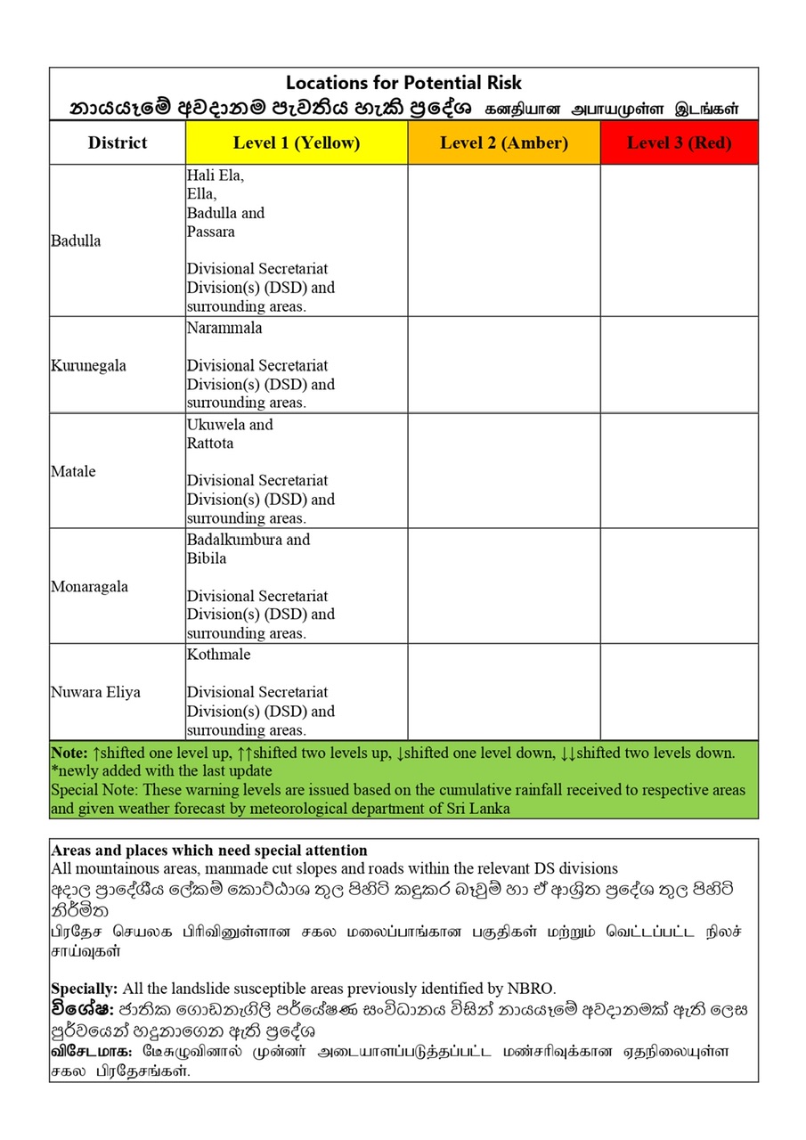 The warning is in place for areas in the Badulla (Hali Ela, Ella, Badulla, Passara), Kurunegala (Narammala), Matale (Ukuwela, Rattota), Monaragala (Badalkumbura, Bibila), and Nuwara Eliya (Kothmale) districts, including surrounding Divisional Secretariat divisions.
