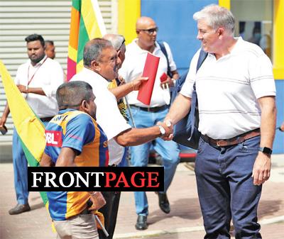 | Sri Lankan cricket head coach Chris Silverwood and fast bowling coach Dharshana Gamage near the team bus in front of the SLC headquarters. before their departure . (pix courtesy SLC) |