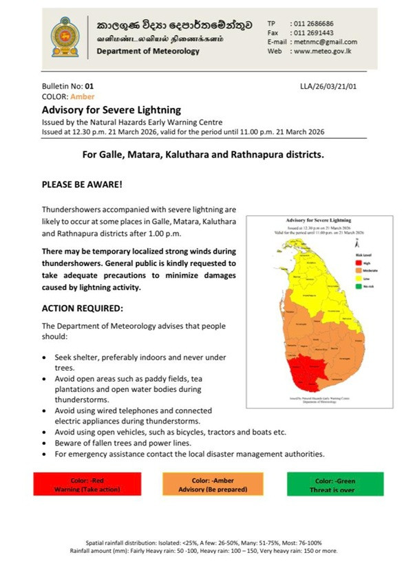 The Department of Meteorology has issued an advisory for severe lightning in the Galle, Matara, Kalutara and Rathnapura districts today (21).
