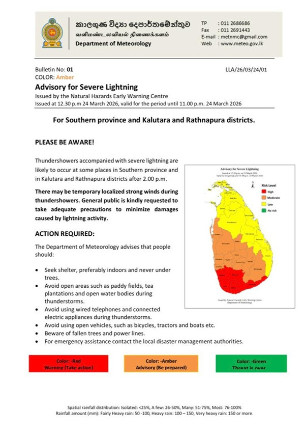 The Department of Meteorology has issued an advisory for severe lightning in the Southern province and the Kalutara and Ratnapura districts today (24).