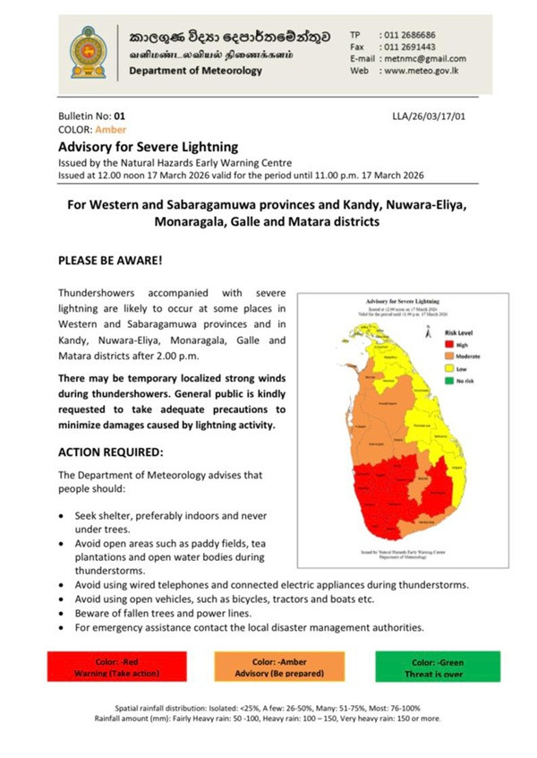 The Department of Meteorology has issued an advisory for severe lightning in the Western and Sabaragamuwa provinces and the Kandy, Nuwara-Eliya, Monaragala, Galle and Matara districts.