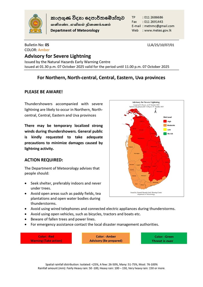 The Department of Meteorology has issued an advisory for severe lightning in the Northern, North-Central, Central, Eastern and Uva Provinces.