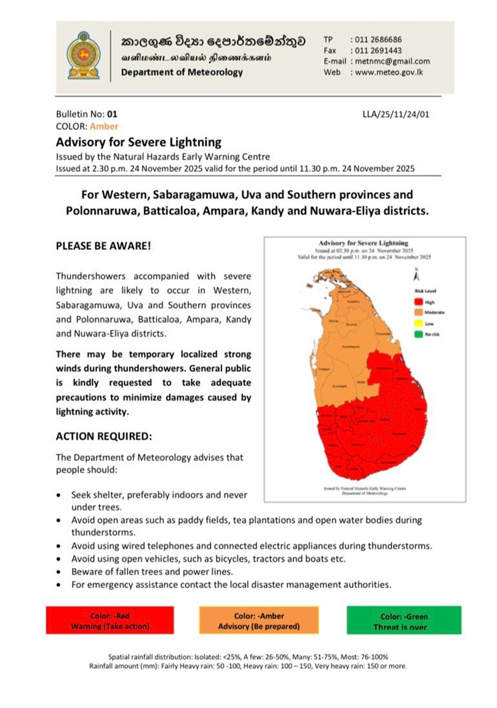 The Department of Meteorology has issued an advisory for severe lightning in the Western, Sabaragamuwa, Uva and Southern provinces and Polonnaruwa, Batticaloa, Ampara, Kandy and Nuwara-Eliya districts today.