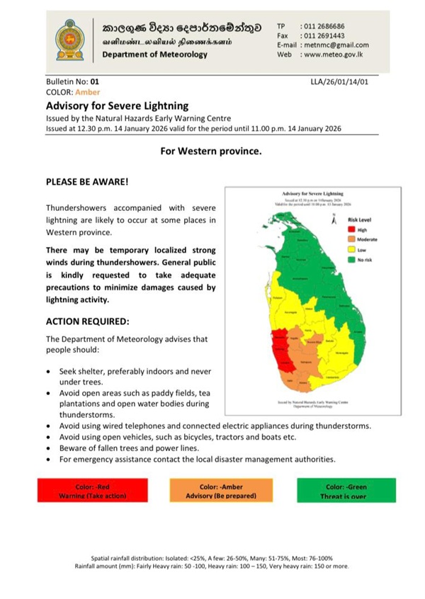 The Department of Meteorology has issued an advisory for severe lightning in the Western Province, effective until 11.00 PM today (14 Jan).