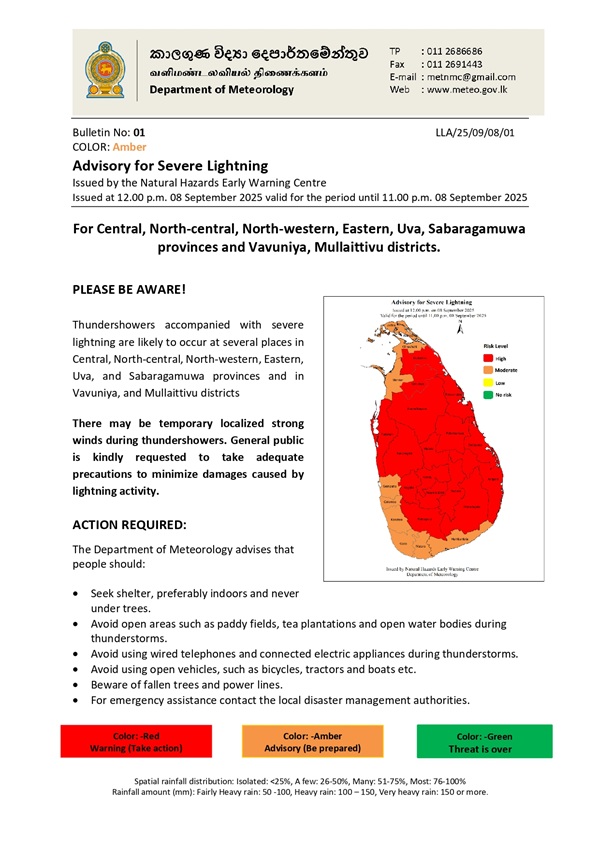 The Department of Meteorology has issued an advisory for severe lightning for the Central, North-Central, North-Western, Eastern, Uva, and Sabaragamuwa Provinces, and the Vavuniya and Mullativu districts.