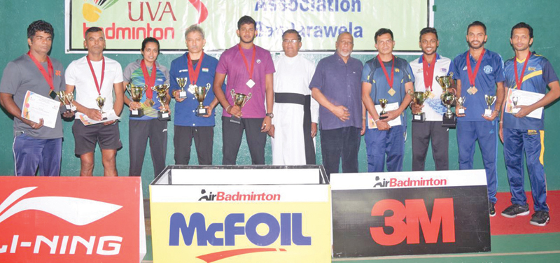 Uva Province all island Badminton tournament winners with the chief Guest   SLB President Rohan de Silva ,Rev Fr Christopher Balaraj and Thilak   Jayasiri after the prasantation ceremony.