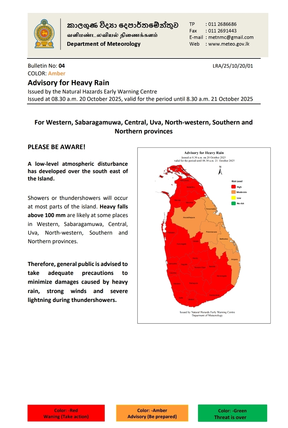 Showers or thundershowers will occur at most parts of the island. Heavy falls above 100 mm are likely at some places in Western, Sabaragamuwa, Central, Uva, North-western, Southern and Northern provinces.