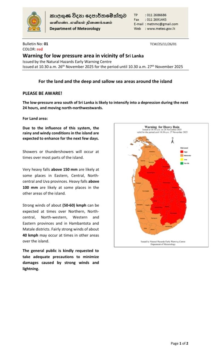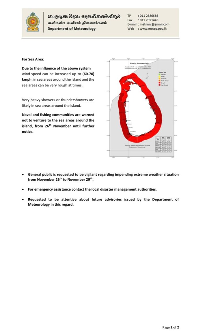 The Department of Meteorology has warned the Naval and fishing communities not to venture into the sea areas around Sri Lanka, from today (26) until further notice.