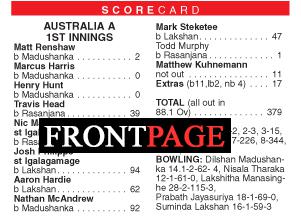 The 21-year-old left arm medium paceman Dilshan Madushanka took bowling honours for Sri Lanka ‘A ‘while Australia’ A’ scored 379 all out after first days play in the first four day cricket fixture played at Mahinda Rajapaksa International cricket stadium Hambantota yesterday.