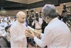 The autobiography ‘Mage Kathawa’ of SJB MP Imthiaz Bakeer Markar was launched at the Ananda College auditorium on Tuesday (05) Picture shows the author presenting the book to Prime Minister Dinesh Gunawardena.