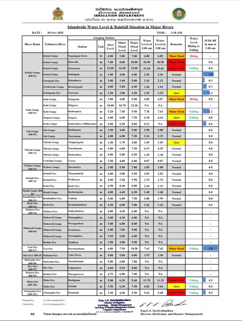 Flood alerts remain in the Norwood area (Kelani River), Magura (Kalu Ganga), Thalgahagoda (Nilawala River), and Giriulla (Maha Oya).