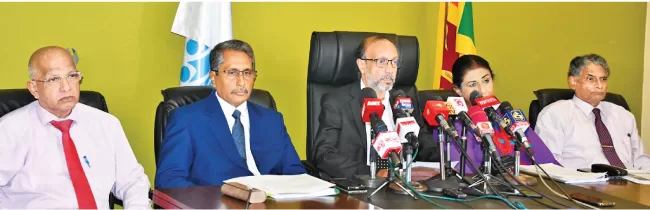 PUCSL Chairman Prof. Manjula Fernando and other members at the media conference yesterday.