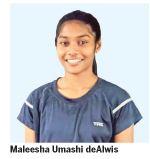 School under 10, 11 and 13 Athletic Champion, Thrice School representative at the John Tarbet Meets . School Best Athlete Elle and Volleyball player Maleesha Umashi de Alwis has brought honour and immense glory to her alma mater Dhammissara Maha Vidyalaya Nattandiya with her deeds in the field of Athletics, Volleyball, Elle, Netball and Cricket.