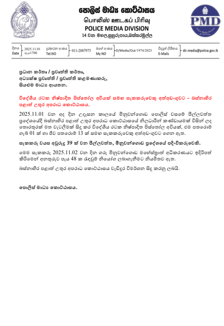 A 39-year-old man from Peellawatta, Minuwangoda, was arrested today (1 November) by the Western Province North Crime Division after being found in possession of a foreign-made pistol, one cartridge, and 13 live rounds, police said.