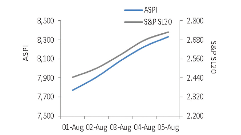 The Bourse ended the week on a positive note this week with ASPI increasing by 602.22 points (or 7.79%) to close at 8,333.37 points, while the S&P SL20 Index also increased by 279.78 points (or 11.43%) to close at 2,728.14 points.