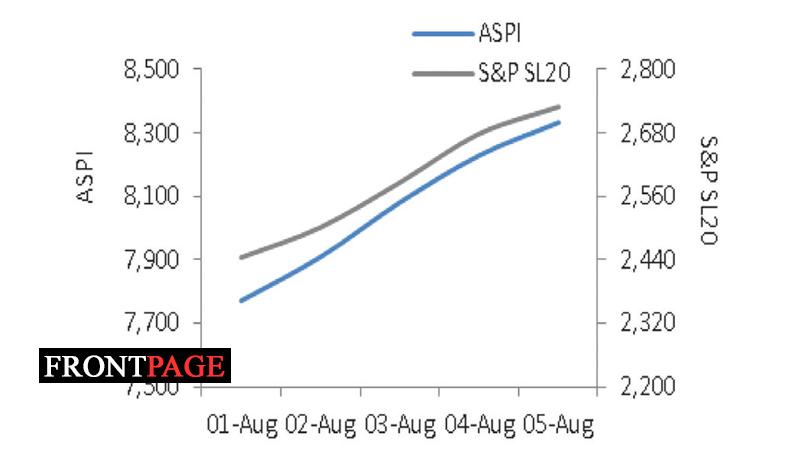 The Bourse ended the week on a positive note this week with ASPI increasing by 602.22 points (or 7.79%) to close at 8,333.37 points, while the S&P SL20 Index also increased by 279.78 points (or 11.43%) to close at 2,728.14 points.