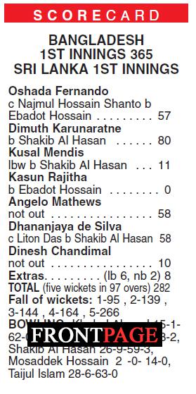 Sri Lanka’s most-productive partnership was the 102-run stand between Mathews and de Silva, who brought contrasting approaches to their innings. Mathews was sedate, venturing only two boundaries in the 76 balls he faced before lunch, before eventually plodding to 58 off 153 by stumps. He left many, defended even more, and subsisted off singles for large portions of his innings, hitting only five boundaries. The most exciting moment of his knock came when he launched Shakib over long off for six to reach his 38th Test fifty.