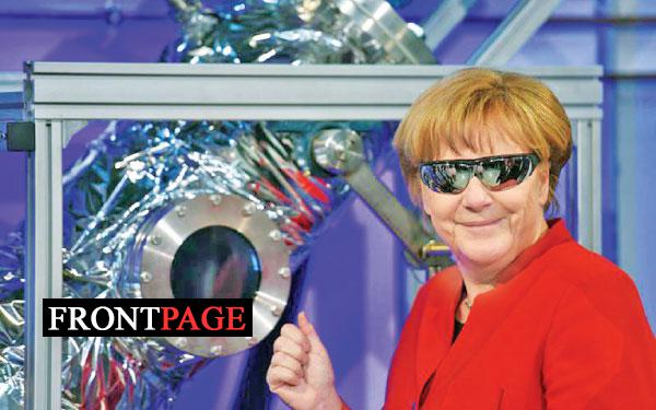 Former German Chancellor Angela Merkel wears safety goggles during a visit to the European Astronauts Centre in Cologne in this 2016 file photo.