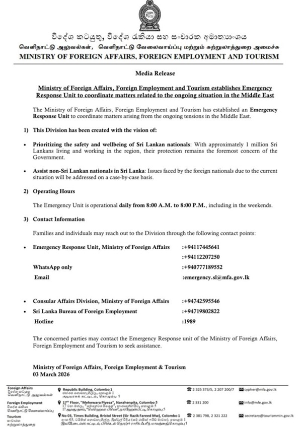 The Ministry of Foreign Affairs has established an Emergency Response Unit to ensure the safety of Sri Lankans living in the Middle East, due to the tense situation prevailing in the region.